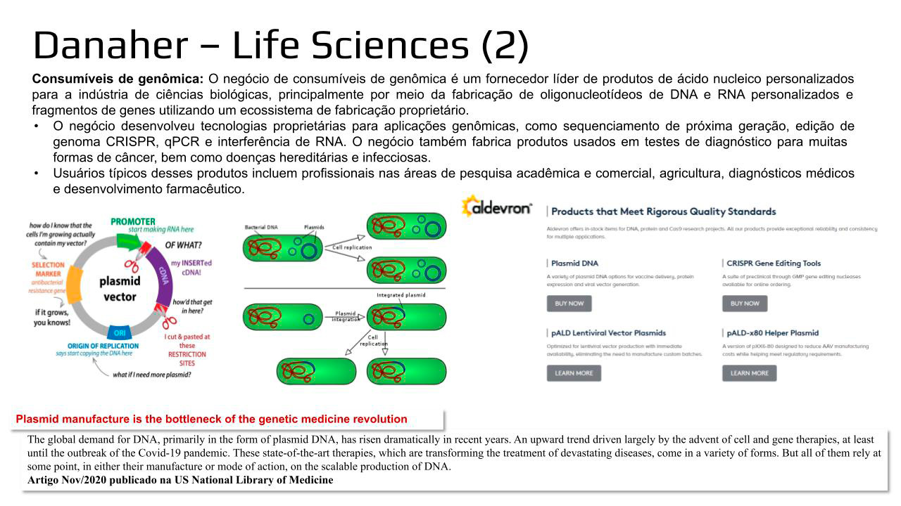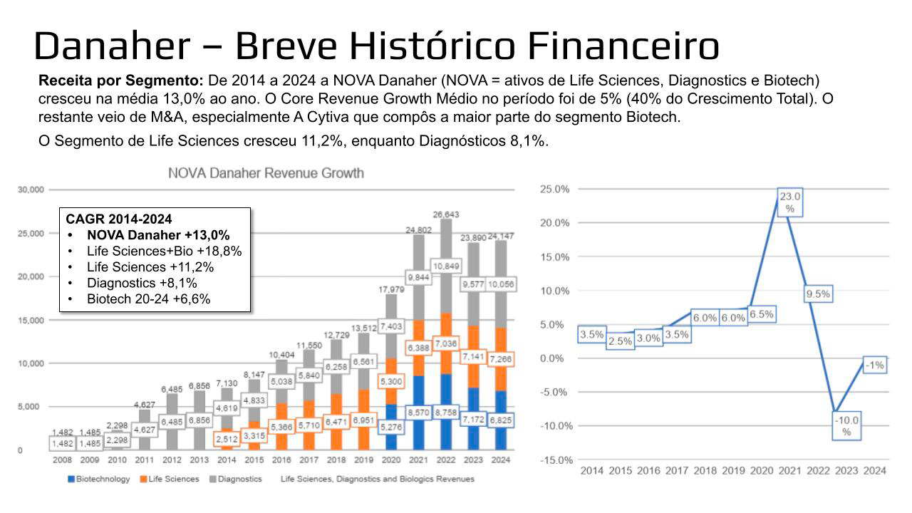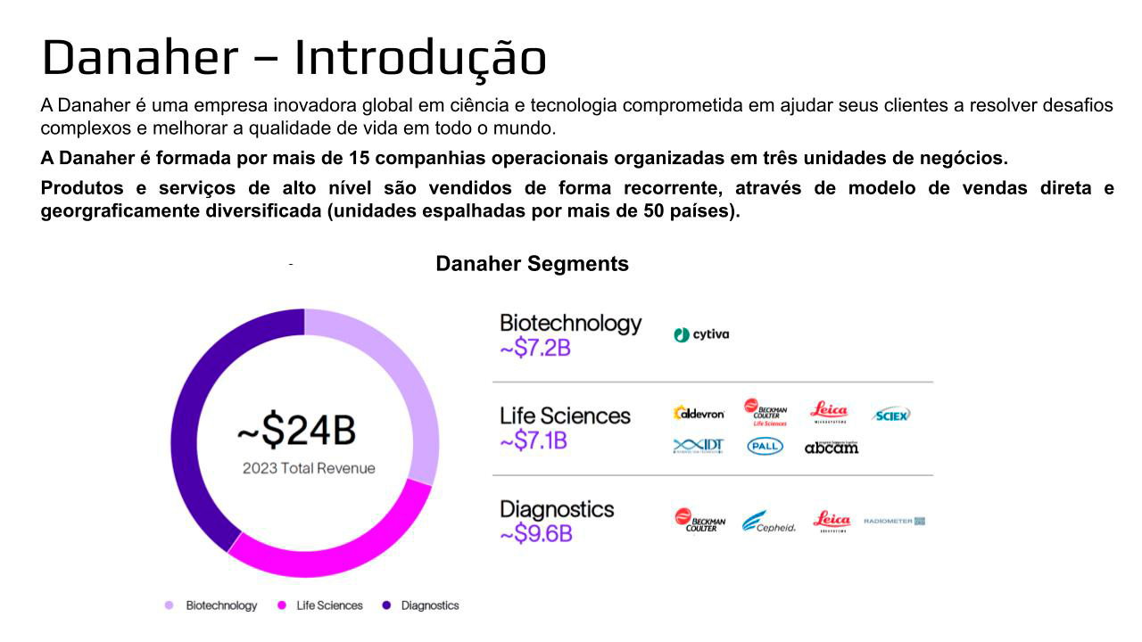 Analisamos a estrutura atual da Danaher, organizada em três grandes plataformas – Biotech, Life Sciences e Diagnostics – com seus respectivos produtos, aplicações e mercados finais. Destacamos também as sinergias operacionais entre Cytiva e Pall, além da liderança em bioprocessamento.
