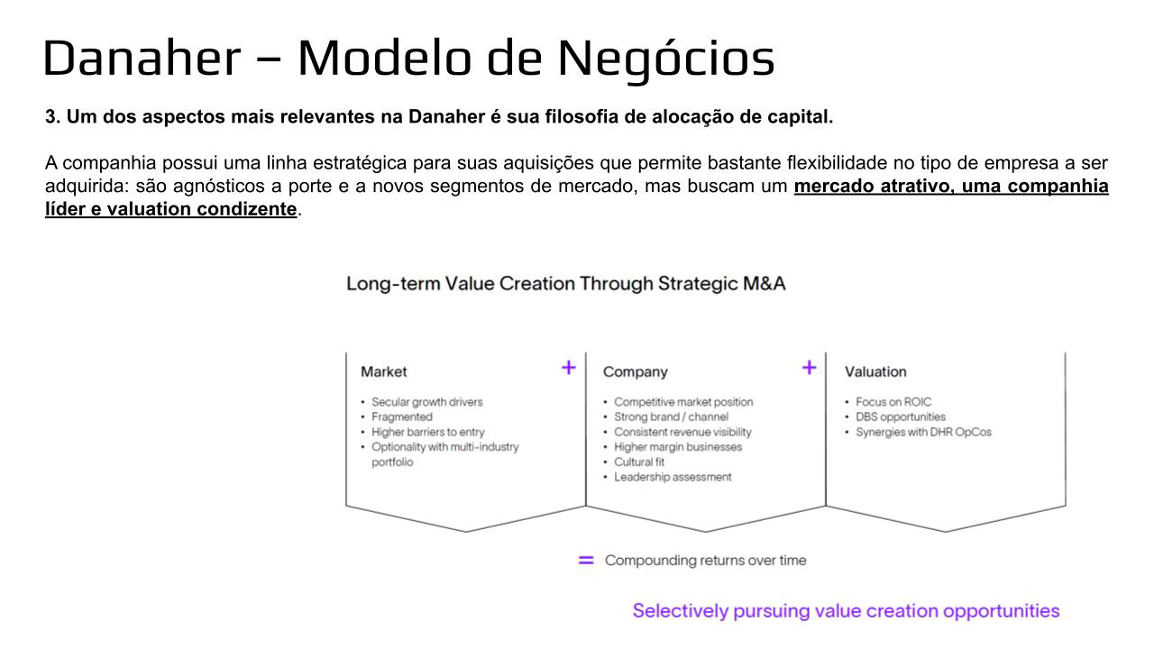 Análise da posição da Danaher em mercados globais, barreiras de entrada, relação com concorrentes como Thermo Fisher e sua lógica de crescimento via aquisições em nichos fragmentados de alta margem, especialmente em biotecnologia e diagnóstico.