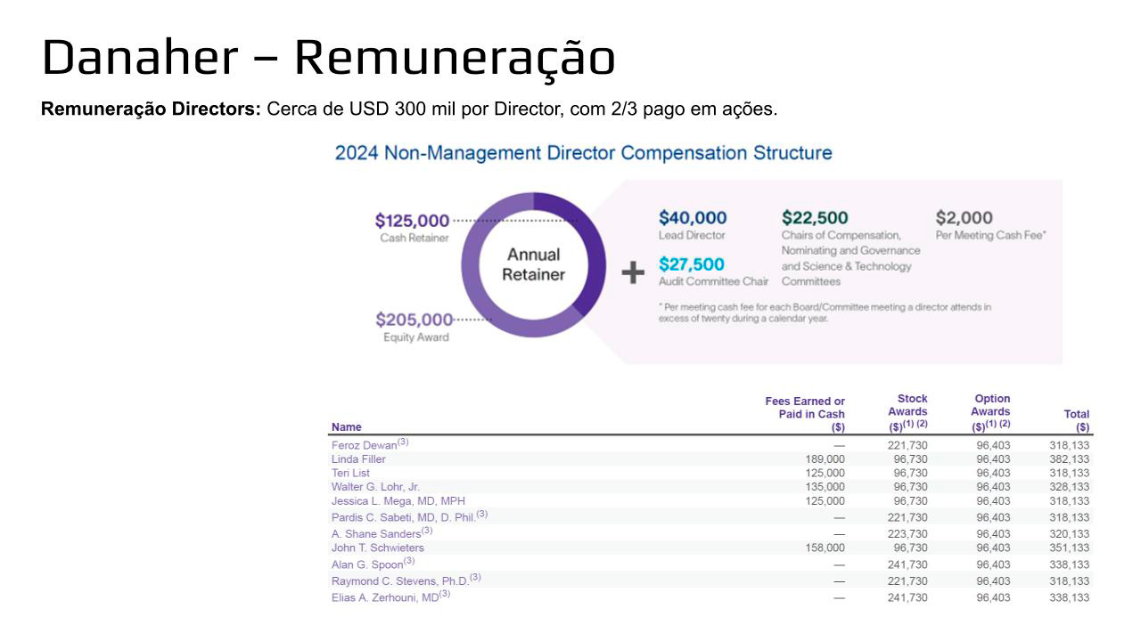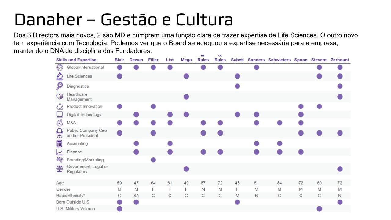 Explore a estrutura de liderança e cultura de longo prazo da companhia, com destaque para o papel dos irmãos Rales, fundadores e membros ativos do board. Avaliamos o modelo de sucessão, remuneração dos executivos e os mecanismos que garantem disciplina na alocação de capital.