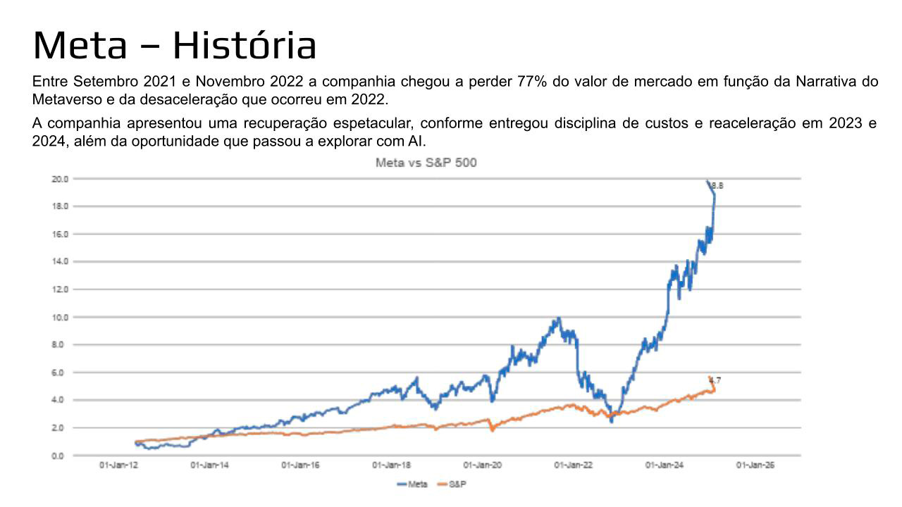 Exploramos também a evolução do modelo de monetização, as perspectivas para o WhatsApp Business e a posição da companhia frente aos desafios regulatórios e concorrência em plataformas. Com margens em recuperação e visão de longo prazo, a Meta se posiciona como um dos ativos mais relevantes da nova era digital.
