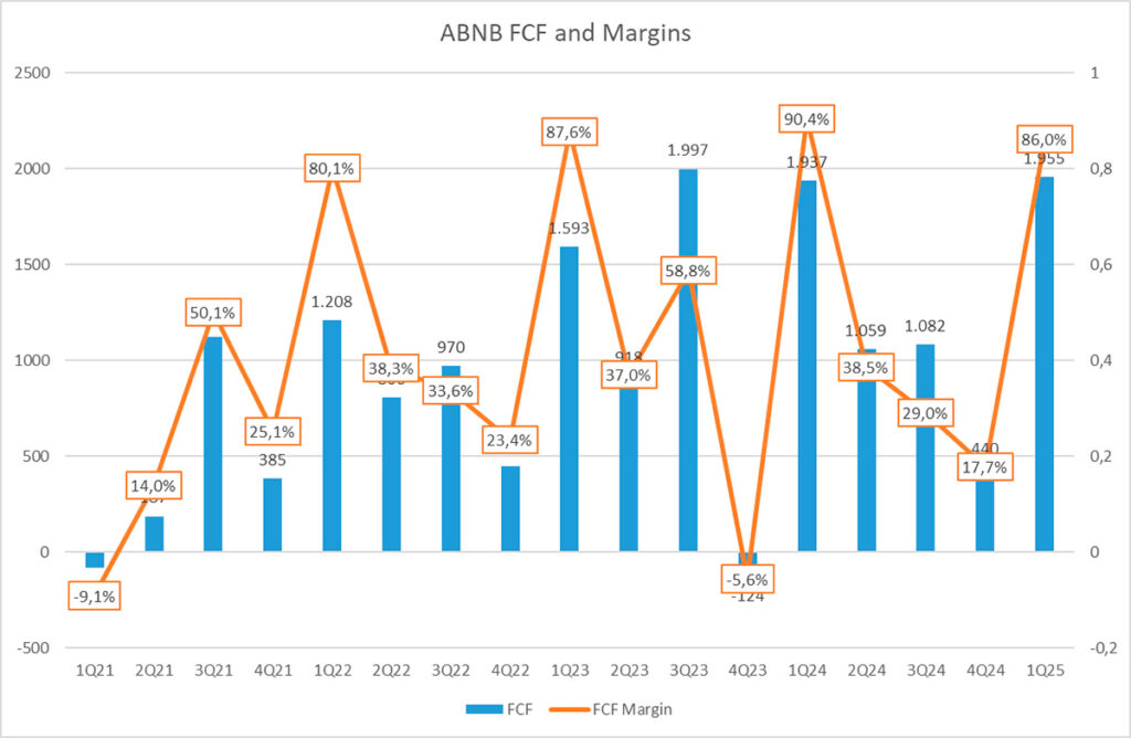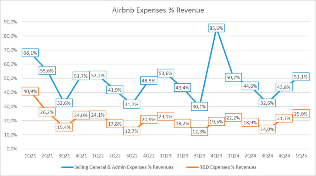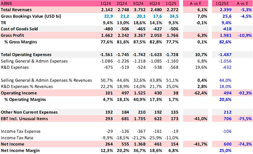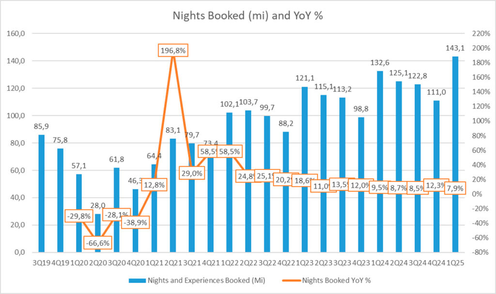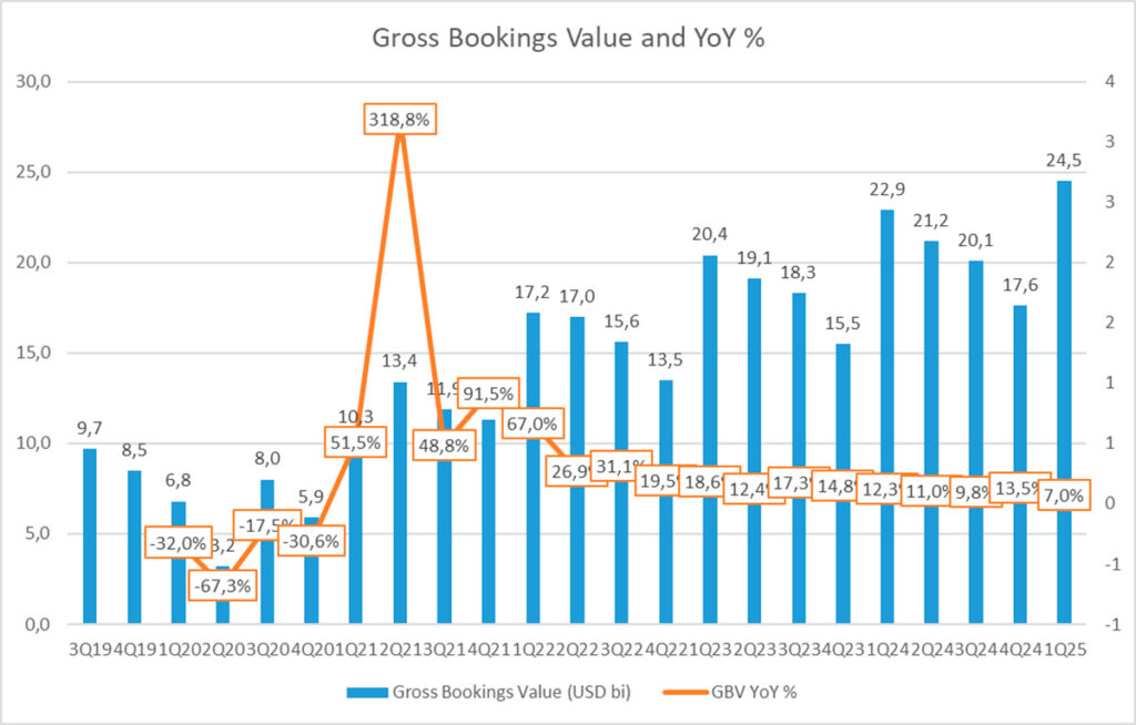 No primeiro trimestre de 2025, a Airbnb reportou um crescimento de 7% em Gross Bookings (GB). Importante lembrar que, no ano passado, a Páscoa caiu no 1Q24, adicionando um efeito de comparação mais desafiador, além de um dia a mais no calendário.