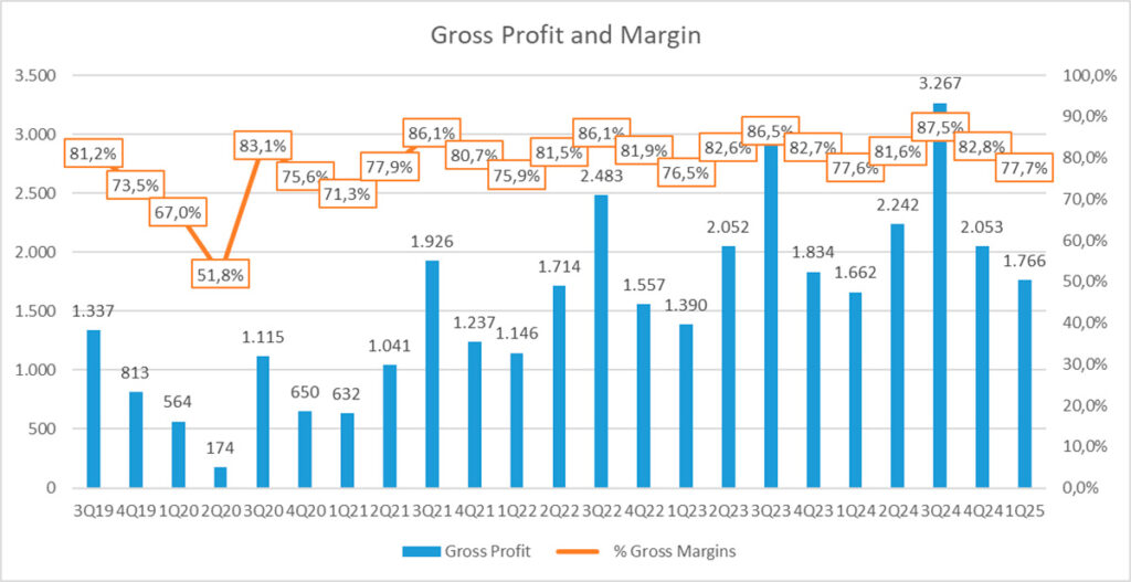 As despesas operacionais cresceram significativamente: P&D aumentou +19,6%, atingindo 25% da receita, reflexo do aumento de investimentos em novas experiências. Durante a call, ficou claro que essa pressão deve continuar, impactando também SG&A, que atingiu 51,1% da receita — acima do projetado, pelo mesmo motivo estratégico.