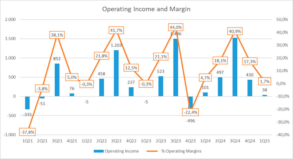 O guidance para o 2Q25 foi estabelecido entre USD 2,99 bilhões e USD 3,05 bilhões em receita, ligeiramente abaixo da estimativa interna da Core Value Quest, de USD 3,08 bilhões.