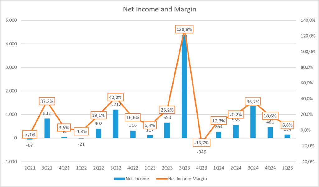O lucro líquido do trimestre foi de USD 154 milhões — cerca de ¼ da expectativa interna, mas alinhado ao consenso de mercado, que previa USD 151 milhões. O trimestre foi amplamente marcado por efeitos de calendário, Páscoa e variações cambiais (FX), além de uma dinâmica volátil, porém sazonal, na margem operacional. Apesar de o 1Q ser tradicionalmente um trimestre de lucro mais baixo, ele se mantém como um período forte de geração de caixa.