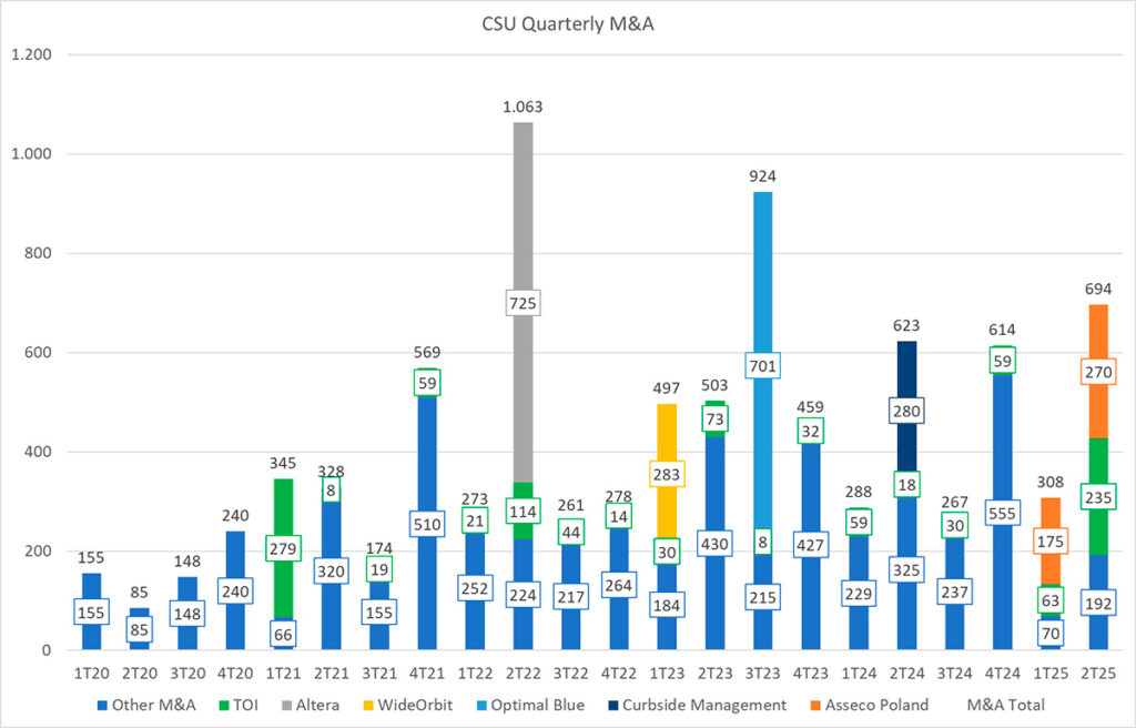 Mais: nas aquisições subsequentes divulgadas até março/25, a CSU informou que já alocou USD 427 milhões no 2T25, dos quais USD 235 milhões pela própria Topicus.
