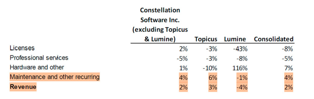 A receita consolidada da Constellation Software cresceu 12,7%, ficando 6% abaixo da nossa estimativa e 3,8% abaixo do consenso de mercado. A receita orgânica, por sua vez, avançou apenas 0,3%, mas sofreu um impacto de quase 2% relacionado ao câmbio.