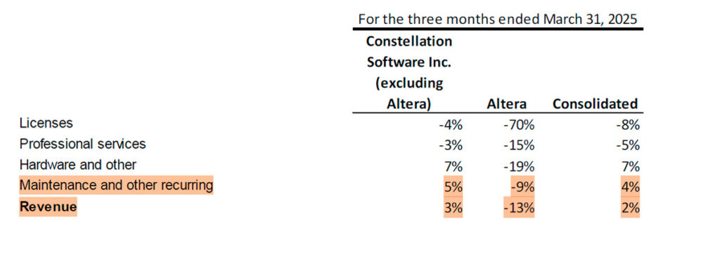 O segmento Altera, focado em software para o setor de saúde, decepcionou com queda de -13% na receita orgânica (versus +2% esperados), refletindo churn persistente nessa unidade.