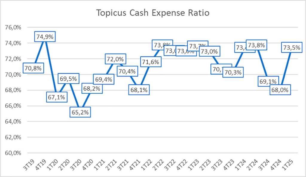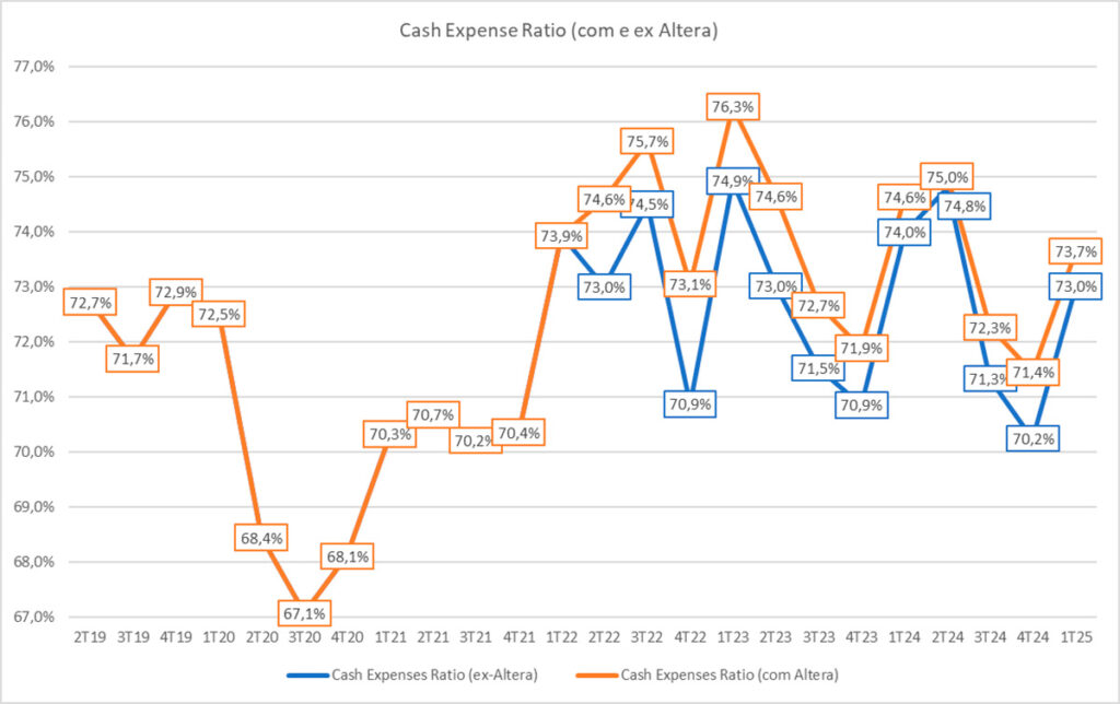 Desde 2022, notamos um padrão mais sazonal no Cash Expense Ratio da Constellation, especialmente após a aquisição da Altera. O 1T costuma ser o ponto mais fraco do ano, e o desempenho atual foi, inclusive, o melhor 1T dos últimos quatro anos nesse indicador.