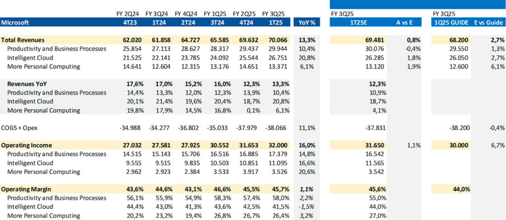A companhia reportou um crescimento de receita de +13,3% GAAP, superando em 0,8% nossas projeções e em 2,7% o próprio guidance, demonstrando forte resiliência e escala. O segmento Productivity and Business Processes (PBP) avançou +10,4%, alcançando USD 30 bilhões (+13% em moeda constante).