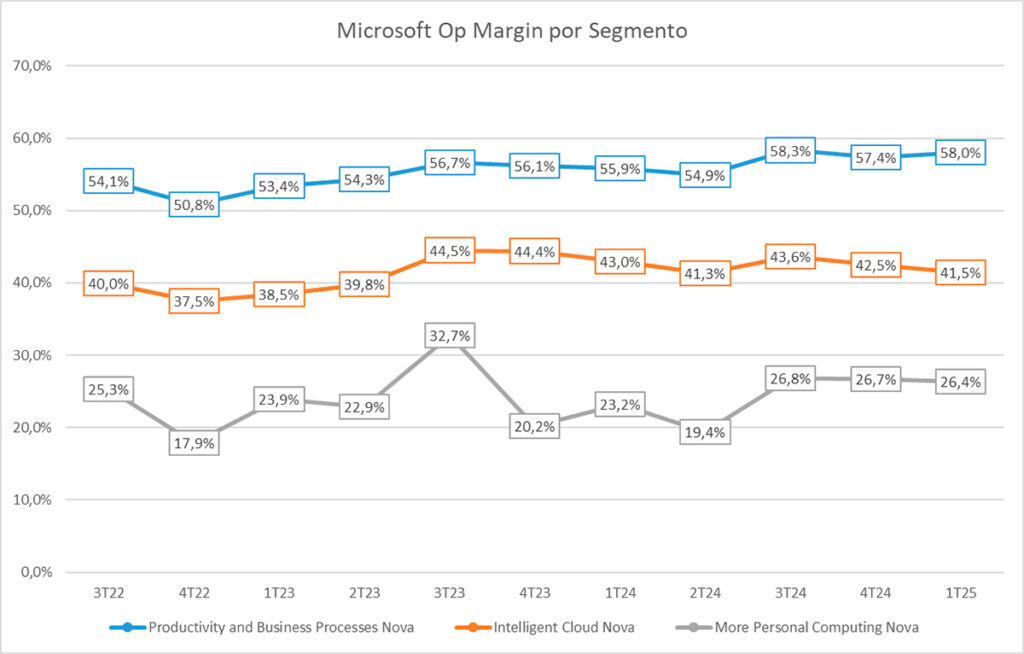 Já o Intelligent Cloud foi destaque absoluto, crescendo +21%, com Azure subindo +35% cc (+33% GAAP). O segmento More Personal Computing (MPC) avançou +6%, com bom desempenho de Windows OEM (antecipação às tarifas) e da área de gaming.