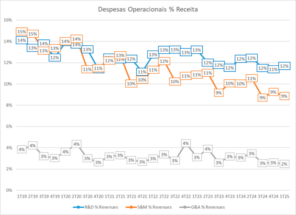 A margem bruta consolidada ficou em 68,7% (0,2pp abaixo das projeções), enquanto o lucro líquido atingiu USD 25,8 bilhões, com margem de 36,9%, ligeiramente abaixo da expectativa (0,8%), beneficiado por um imposto efetivo de 18% (menor que os 19% previstos).