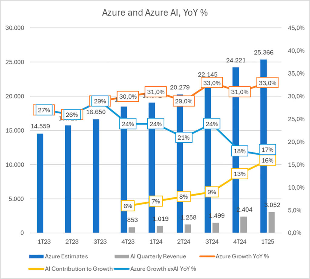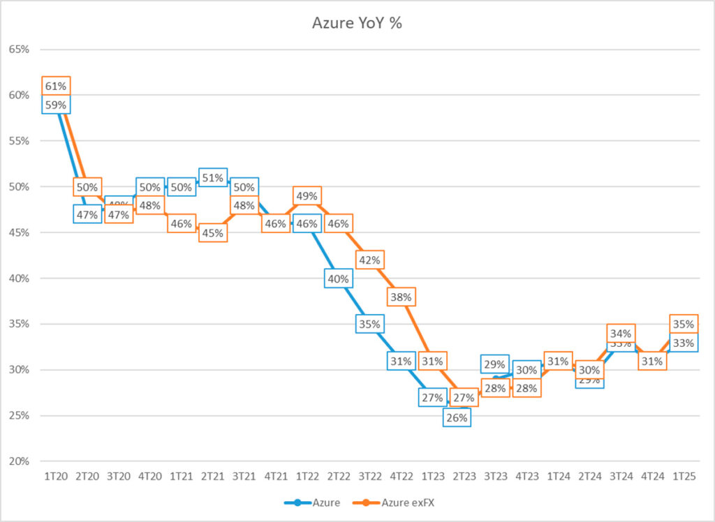 O maior destaque foi Cloud, com crescimento de +22,2%. Segundo Satya Nadella, a surpresa positiva não veio apenas dos workloads de AI, mas também de bancos de dados como Snowflake e Databricks, reforçando uma reaceleração da migração cloud.