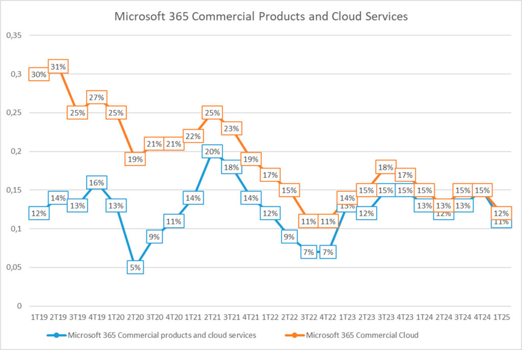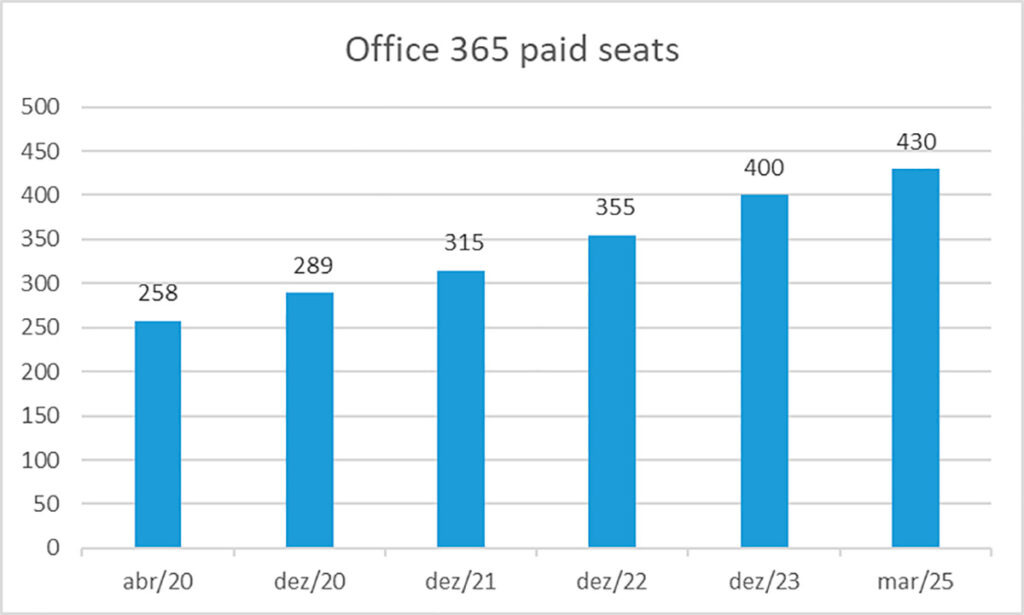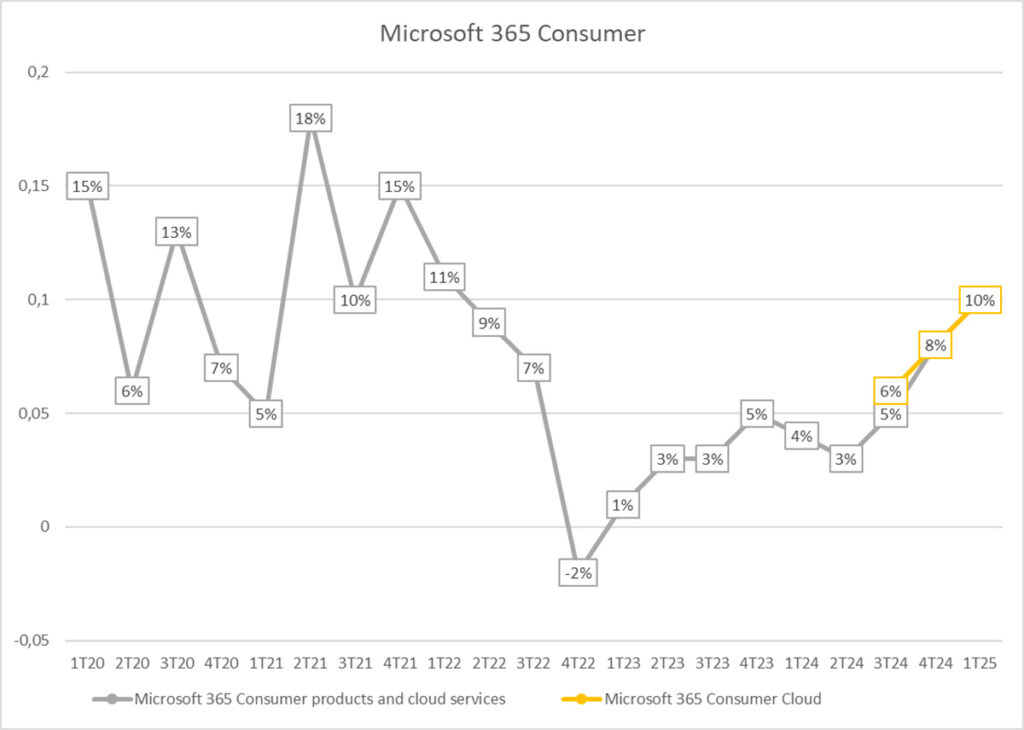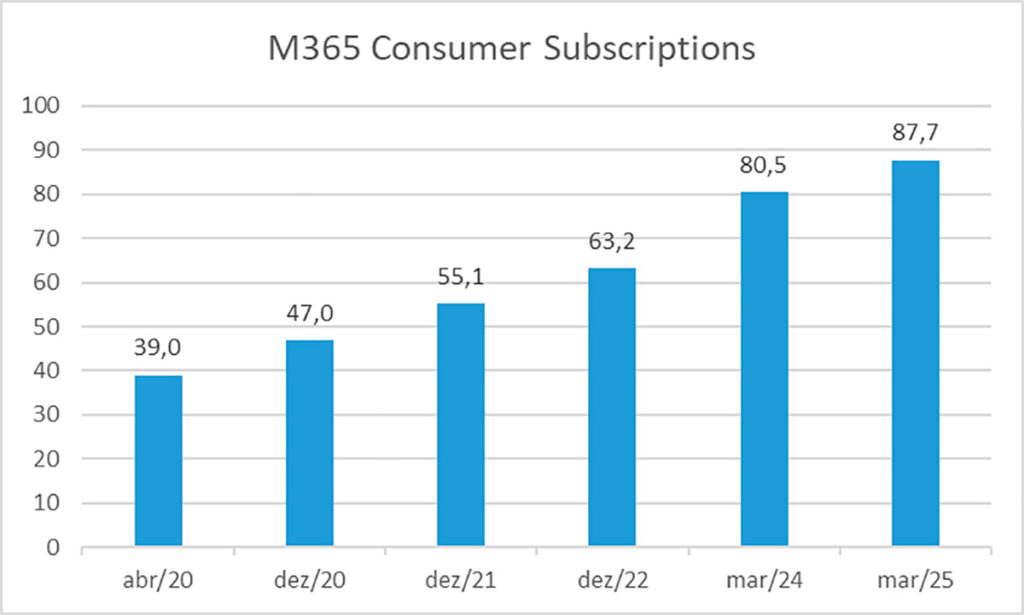 No Microsoft 365 Commercial, o crescimento foi de +11%, puxado por +7% em seats e aumento de ARPU graças ao pacote premium E5 e ao M365 Copilot. O Microsoft 365 Consumer avançou +10,5% (+12% cc), atingindo 87,7 milhões de assinantes (+9%).