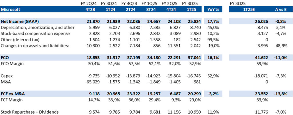 A Microsoft manteve disciplina operacional, com despesas crescendo apenas 2,4% YoY, enquanto o headcount avançou +2% YoY. O commercial bookings RPO cresceu expressivos 33%, alcançando USD 315 bilhões (4,5x a receita trimestral), e o cRPO (12 meses) aumentou 17%.