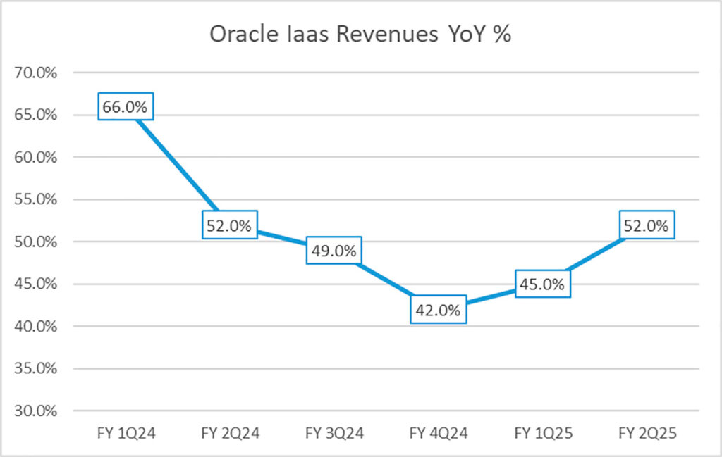 - Dentro de Cloud Services, o segmento de OCI (Infra Cloud Services) acelerou de +45% para +52% YoY