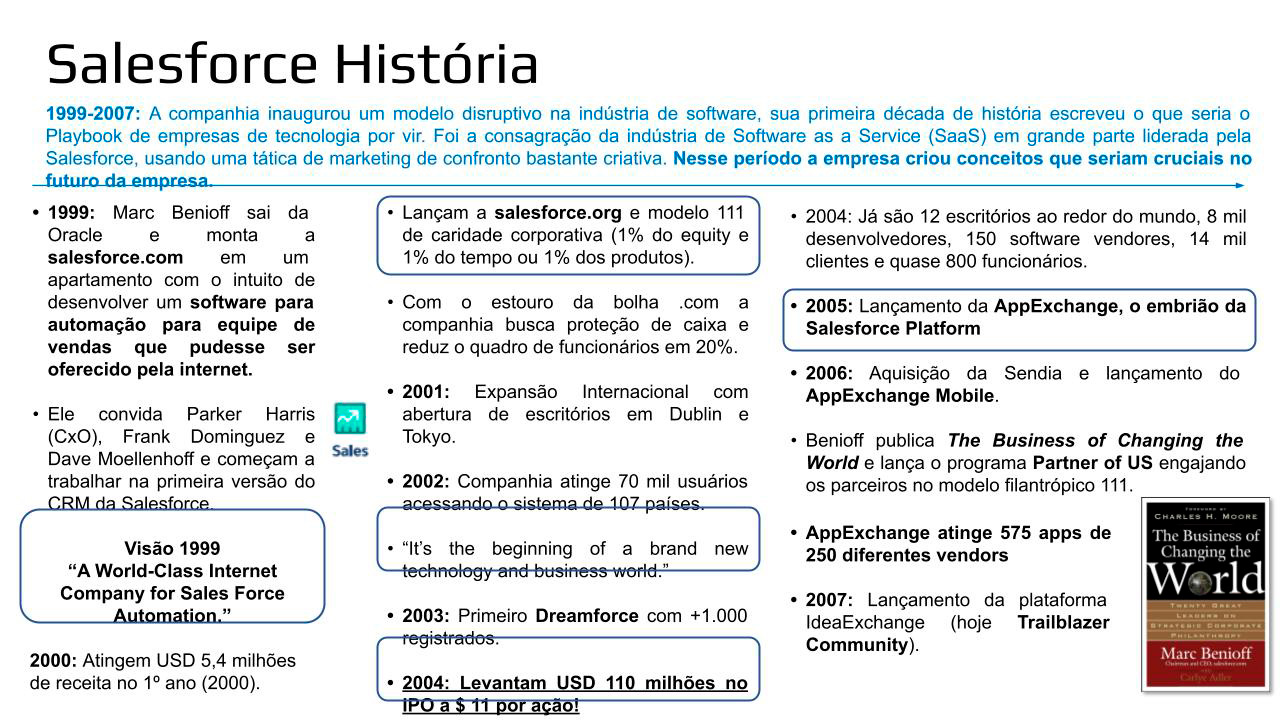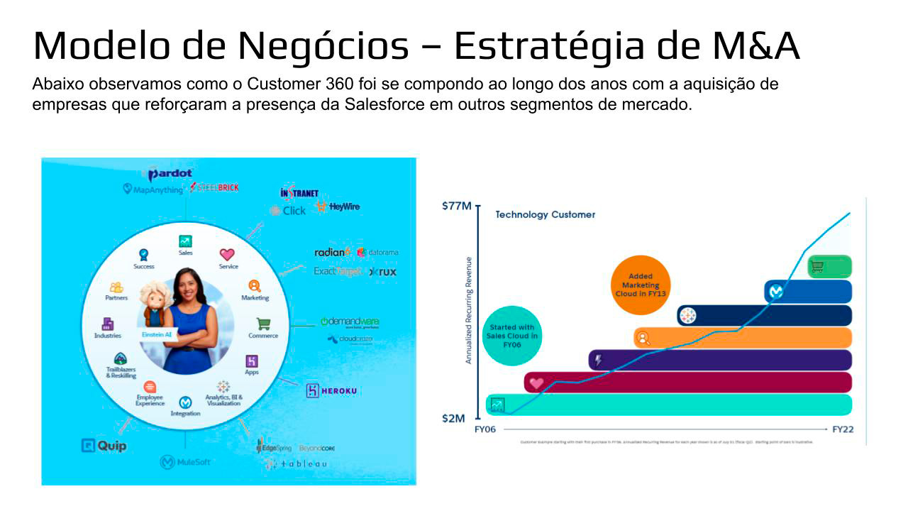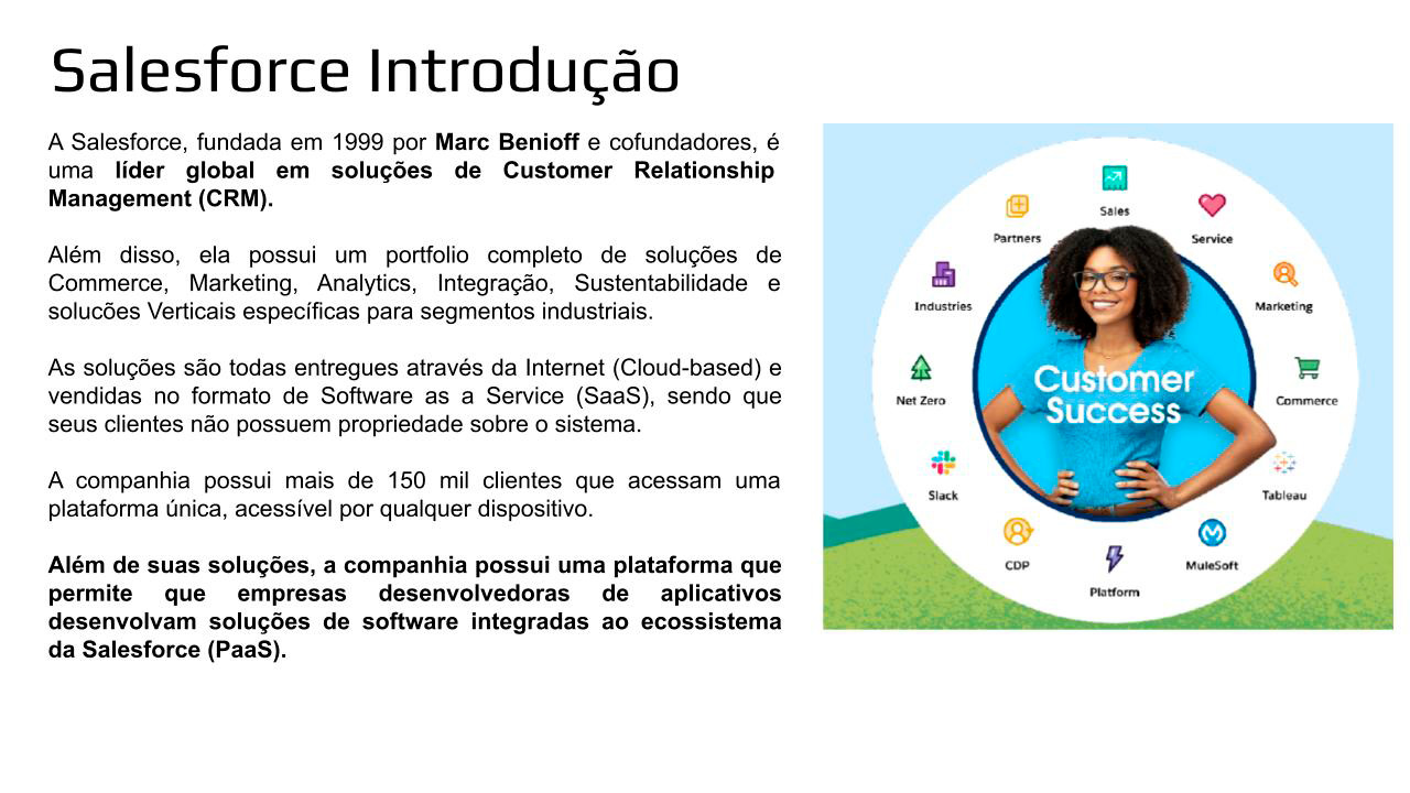 A Salesforce é líder global em CRM e um dos maiores ecossistemas de software corporativo do mundo. Neste relatório, exploramos seu portfólio integrado – Sales, Service, Marketing, Commerce e Data Cloud – e sua estratégia de crescimento baseada em aquisições e inovação contínua.