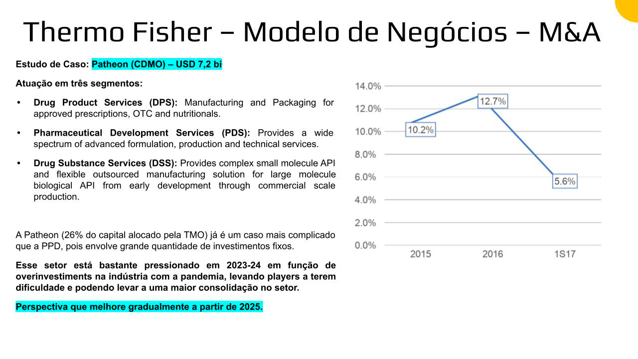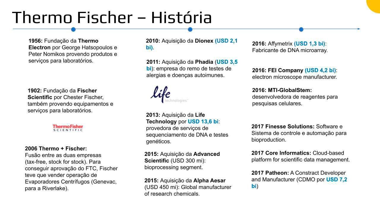 A Thermo Fisher é uma das líderes globais em ciência e tecnologia para saúde, com presença marcante em biotecnologia, diagnóstico, pesquisa laboratorial e produção farmacêutica. Neste relatório, analisamos o modelo Razor/Razorblade da companhia, a recorrência de receita com alto valor agregado e sua estratégia de crescimento via aquisições.
